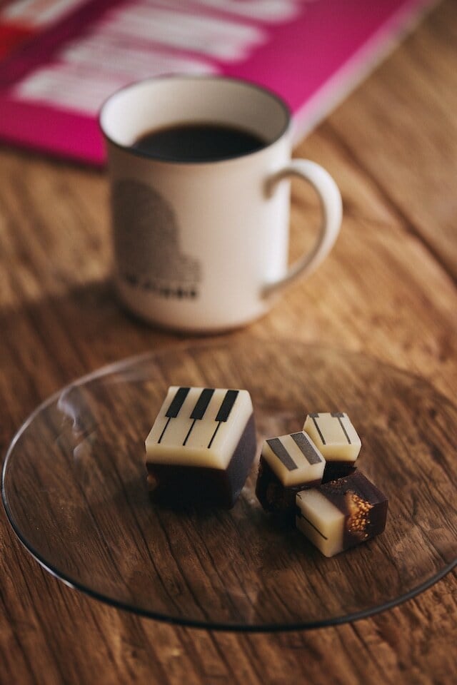 ジャズ羊羹の表面は、思わず弾きたくなる、小さなピアノのような可愛らしさ。ミルク餡と竹炭で表現したピアノの鍵盤柄は、「刷り込み」という和菓子の伝統的な技法で、職人が一つ一つ手仕事で仕上げています。